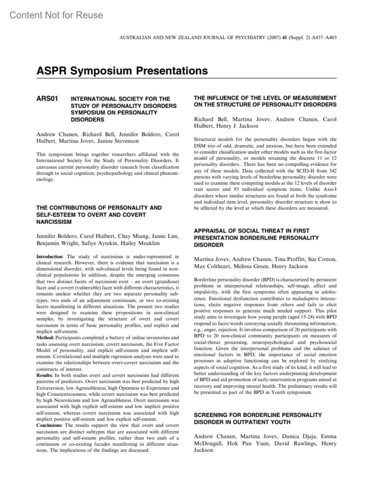ASPR Symposium PresentationsAustralian and New Zealand Journal of Psychiatry 41(2_suppl):p A457-A465, February 2007. | DOI: 10.1080/00048670701757076Copyright © 2007 Sage Publications