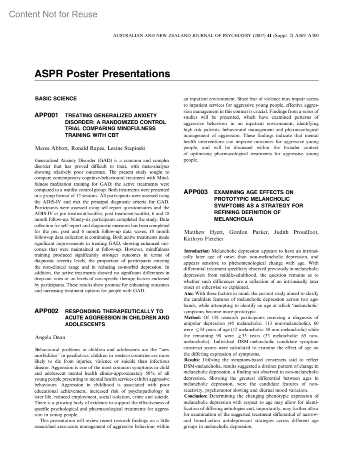 ASPR Poster PresentationsAustralian and New Zealand Journal of Psychiatry 41(2_suppl):p A469-A500, February 2007. | DOI: 10.1080/00048670701757092Copyright © 2007 Sage Publications