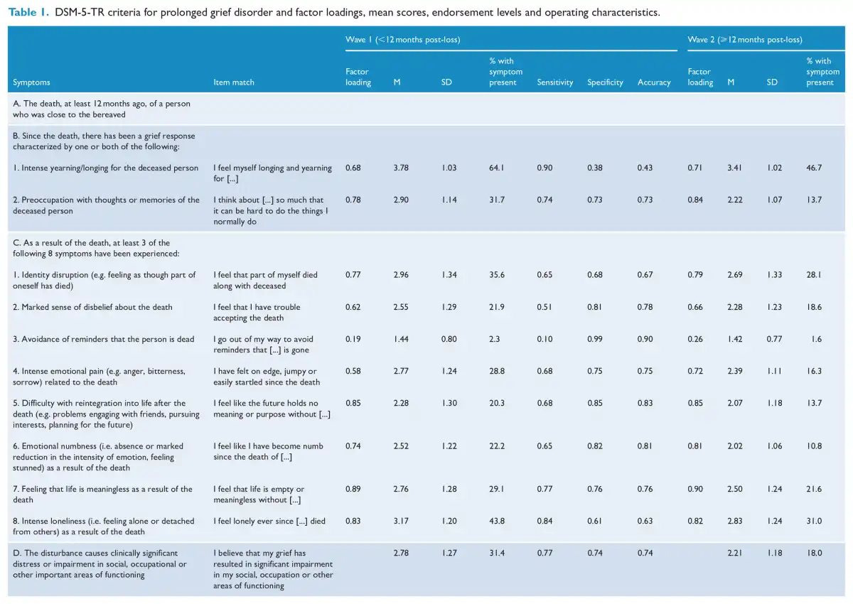 Notwithstanding these considerations, this study extends previous findings by demonstrating that prevalence rates of and risk factors for DSM-5-TR-based PGD resemble rates and risks established in earlier research, using different criteria to define disordered grief; this attests to the construct validity of DSM-5-TR PGD. Our findings support prior indications that early elevated PGD symptoms are important harbingers of later PGD (e.g. ). The finding that bereaved individuals at risk of long-term dysfunction may be effectively identified before the first anniversary of the death raises doubt about the appropriateness of the ≥12-month time criterion of DSM-5-TR PGD. Combined with earlier findings that elevated PGD within the first 12 months of bereavement predicts later distress and dysfunction (; ; ) and considering the ≥6-month criterion for ICD-11 PGD (), it seems imperative to continue investigating the diagnostic validity and clinical utility of the ≥12-month time criterion. From a clinical staging perspective, our findings indicate that experiencing elevated PGD symptoms characterizes people in the early stages of the development toward full of PGD. As such, people experiencing these early symptoms—particularly those also having other risk factors (loss of close kin, violent loss)—may be candidates for early preventive care of watchful waiting. It would be useful for future studies to further examine early predictors of PGD to inform advances in such care.