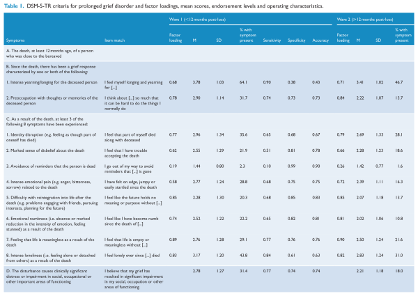 After the death of a loved one, most people experience acute sadness and grief. Only a minority, though, develops persistent symptoms, yielding sufficient distress and disability to warrant a diagnosis of disordered grief (; ; ). Because signs and symptoms of pervasive grief are insufficiently captured by existing diagnostic categories, disordered grief has now been included as a distinct diagnostic category in psychiatric classification systems. That is, the forthcoming 11th edition of the International Classification of Diseases (ICD-11; ) includes prolonged grief disorder (PGD). And in follow-up of ‘persistent complex bereavement disorder’ included in Section III of the 5th Edition of the Diagnostic and Statistical Manual of Mental Disorders (DSM-5; ), a disorder also named PGD (albeit defined by slightly different criteria) will be included in the forthcoming text revision of DSM-5 (DSM-5-TR; ; , ). PGD in ICD-11 is characterized by yearning or preoccupation, accompanied by one or more manifestations of intense emotional pain, causing distress and impairment beyond 6 months after the loss of a significant other. PGD as per DSM-5-TR can be diagnosed when, beyond the first anniversary of the loss, the person has been experiencing separation distress plus several accompanying symptoms nearly every day or more often for at least the last month to a distressing and disabling degree. This study focused on PGD in DSM-5-TR.