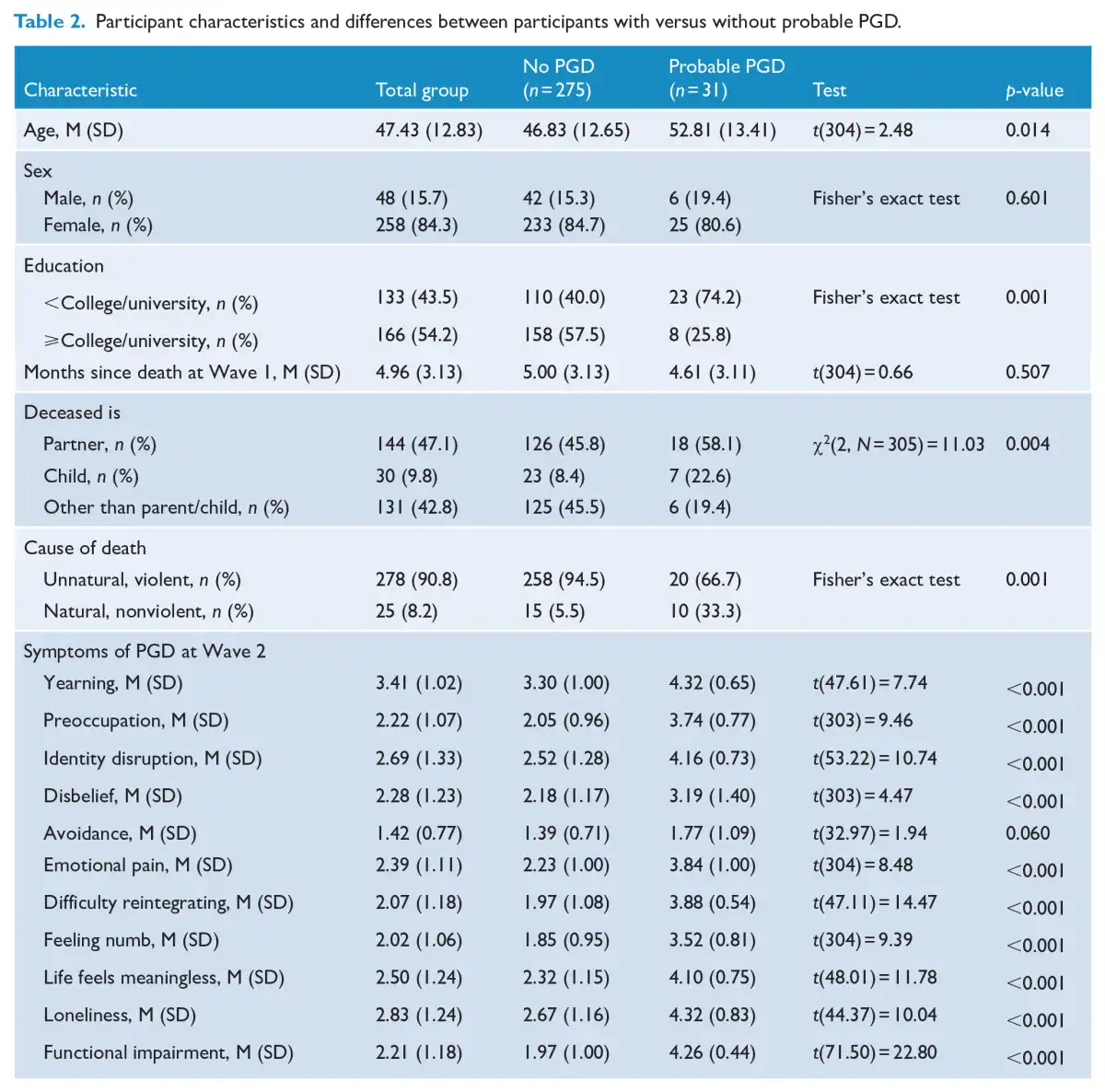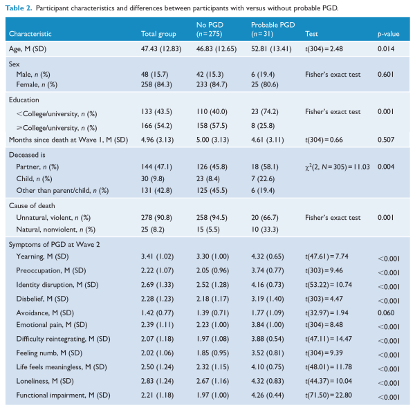 Regarding the second aim, Table 2 summarizes differences in socio-demographic and loss-related variables between the 31 participants with and the 275 participants without probable PGD (Wave 2), plus statistical tests of these differences. Probable PGD caseness did not differ as a function of gender and time since death but was more prevalent among participants who were older and those with lower education. Caseness also varied by kinship (more people confronted with the death of a partner or child in the PGD group compared to the no PGD group) and cause (more people confronted with unnatural/violent deaths in the PGD group).