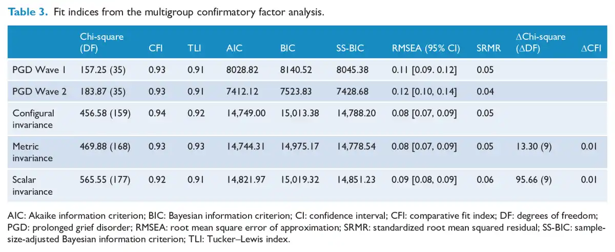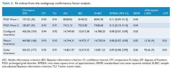 Table 3 shows fit indices of the multigroup CFAs, with respect to the third aim of this study. The model with all 10 items loading on one latent PGD factor showed acceptable fit at both occasions, demonstrating configural invariance of PGD items in this sample. Comparing the configural model to a second model with item factor loadings constrained to be equal across waves yielded a non-significant chi-square difference test and a small difference in CFI (≤0.01). This supports metric invariance. Next, we examined scalar invariance; although the chi-square difference test comparing the models with scalar versus metric invariance was significant, the difference in CFI was small (ΔCFI = 0.01). Taken together, these findings supported longitudinal measurement invariance of PGD in this sample.