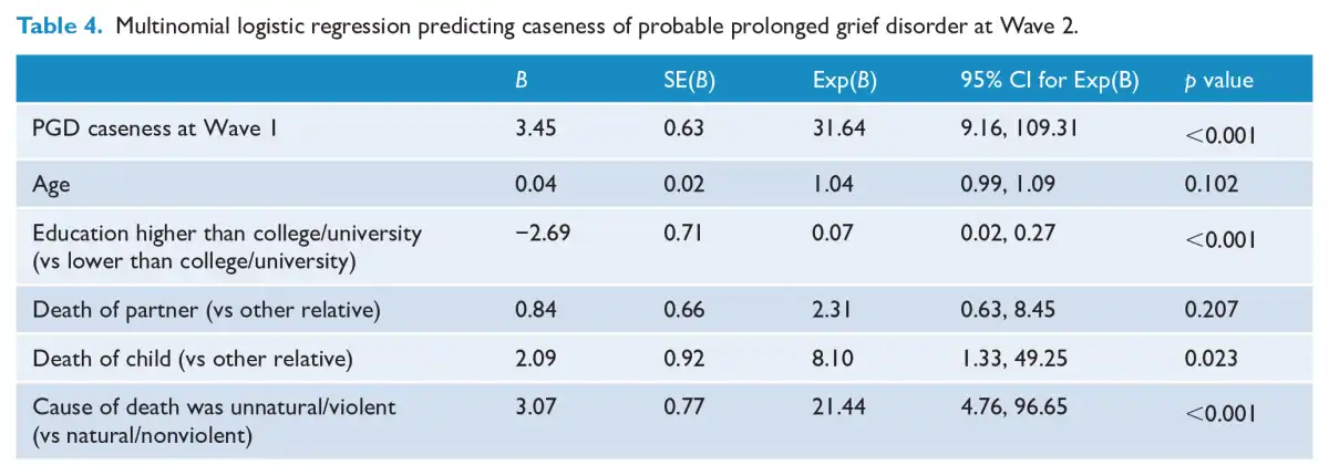 Table 4 summarizes outcomes of a multivariate logistic regression including all significant (univariate) predictors (PGD caseness at Wave 1, age, education, death of a partner or child, unnatural/violent loss). Taken together, these predictors explained 53.3% of the variance in probable PGD caseness (sensitivity = 56.67%, specificity = 98.12%, 93.92% correct classifications). Variables emerging as unique predictors of meeting criteria for probable PGD (at Wave 2) were meeting criteria for PGD caseness at Wave 1, lower education, loss of a child and loss to unnatural/violent causes.