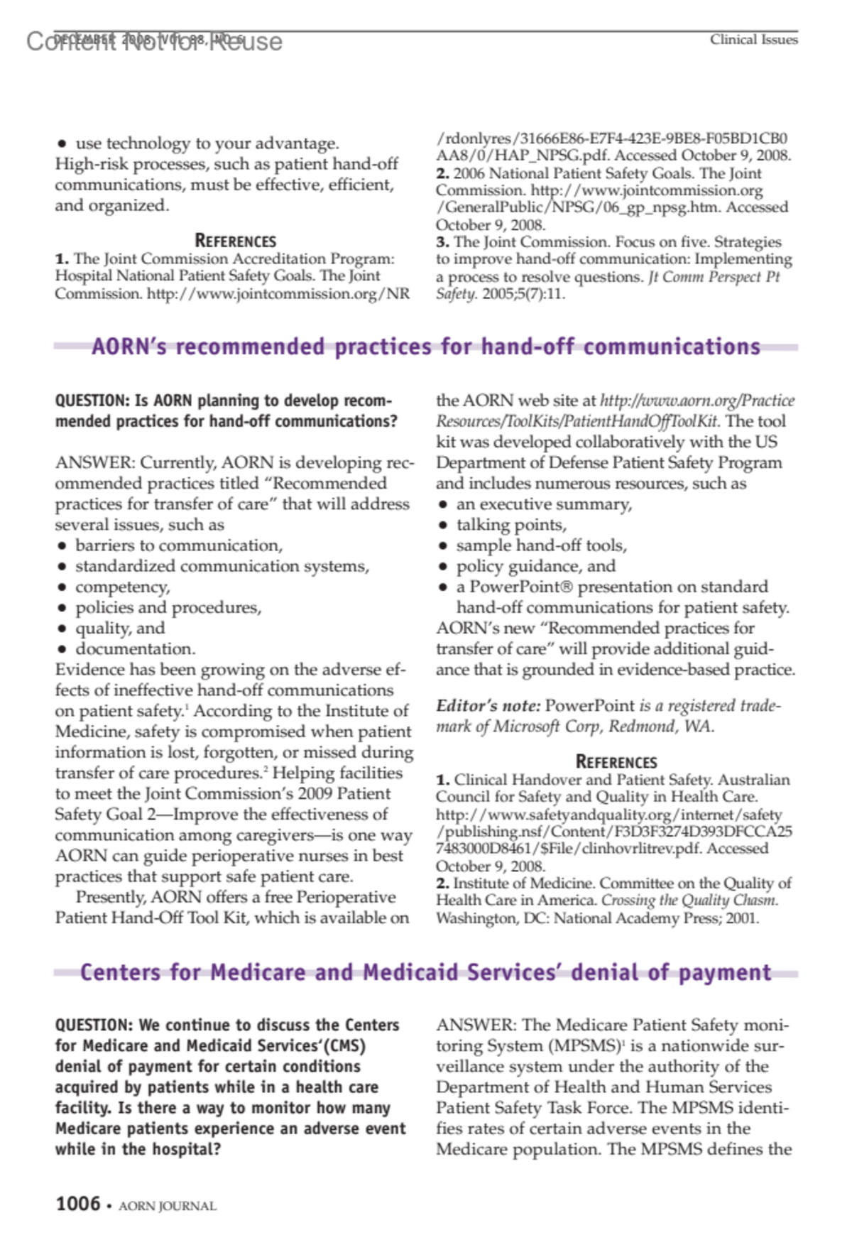 Centers for Medicare and Medicaid Services' denial of paymentCHARD, ROBIN RN, PhD, CNORAuthor informationPerioperative nursing specialistAORN Center for Nursing PracticeAORN Journal 88(6):p 1006-1007, December 2008.Copyright © 2008 AORN