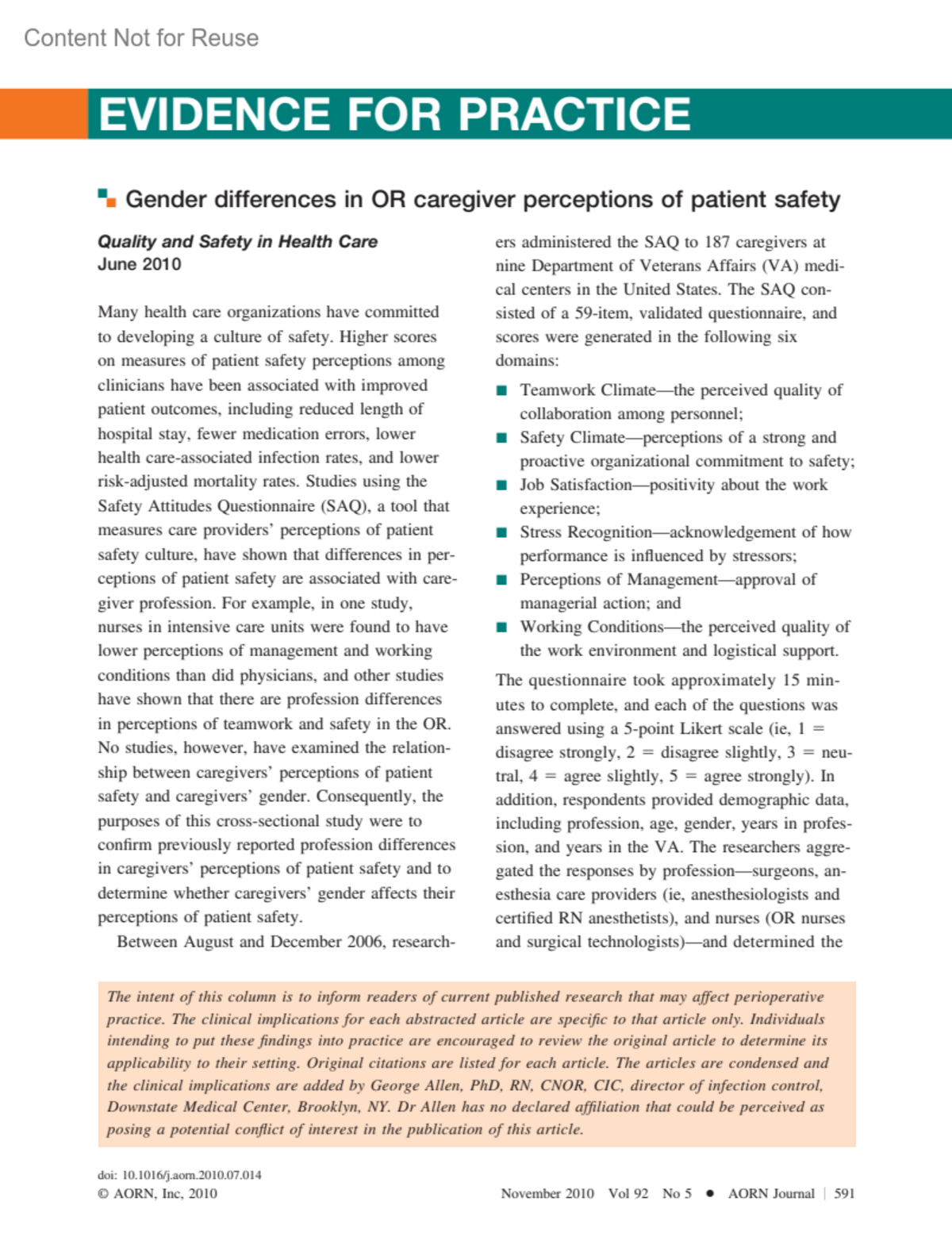 The intent of this column is to inform readers of current published research that may affect perioperative practice. The clinical implications for each abstracted article are specific to that article only. Individuals intending to put these findings into practice are encouraged to review the original article to determine its applicability to their setting. Original citations are listed for each article. The articles are condensed and the clinical implications are added by George Allen, PhD, RN, CNOR, CIC, director of infection control, Downstate Medical Center, Brooklyn, NY. Dr Allen has no declared affiliation that could be perceived as posing a potential conflict of interest in the publication of this article.