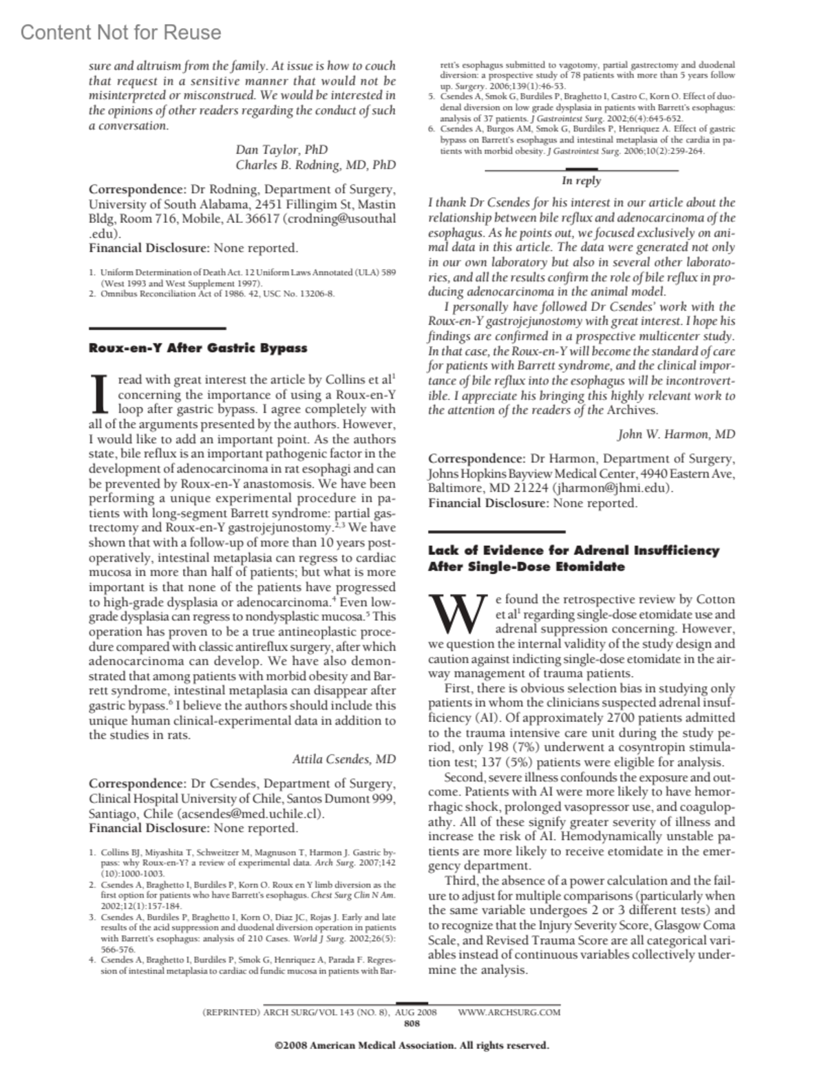 Archives of Surgery 143(8):p 808-809, August 2008.