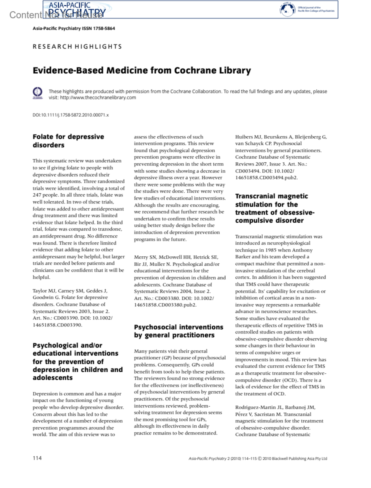 Psychosocial interventions by general practitionersHuibers, M JBeurskens, ABleijenberg, Gvan Schayck, C PAuthor informationPsychosocial interventions by general practitioners. Cochrane Database of Systematic Reviews 2007, Issue 3. Art. No.: CD003494. DOI: 10.1002/14651858.CD003494.pub2.Asia-Pacific Psychiatry 2(2):p 114, June 2010.Copyright © 2010 John Wiley & Sons, Inc.