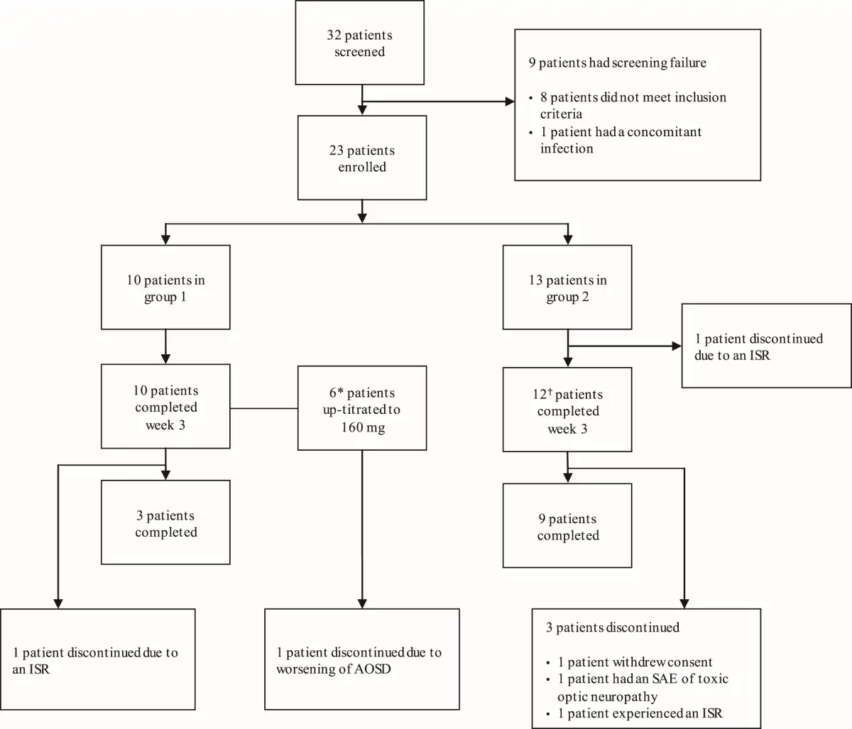 AEs led to the permanent discontinuation of the study in four patients, including three cases of ISR, one with 80 mg and two with 160 mg tadekinig alfa doses, respectively, and one case of SAE due to toxic optic neuropathy (details within the online supplementary materials). The patient who was up-titrated from 160 mg to 320 mg tadekinig alfa experienced no AE besides mild ISR.