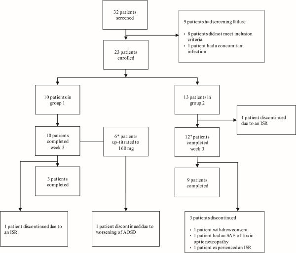 Patient disposition. *One responder and five non-responders. One patient (responder) was up-titrated to 320 mg. AOSD, adult-onset Still’s disease; ISR, injection site reaction; SAE, serious adverse event.