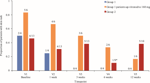 Evolution of skin rash over time. Presented fractions show number of patients with rash at each V/total number of patients. *Four patients did not have V4, but had V5 or V6 (early termination V). V, visit.