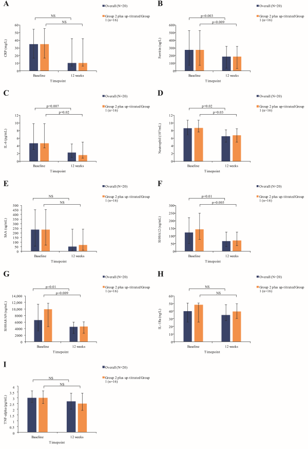 Evolution of serum biomarker levels by group and time point: (A) CRP; (B) ferritin; (C) IL-6; (D) neutrophil; (E) SAA; (F) S100A12; (G) S100A8/A9; (H) IL-1Ra; (I) TNF-alpha. Data are median (IQR). The 20 patients included in the overall group comprised 17 patients who had baseline values and at week 12, and 3 patients with values at week 6, but who discontinued thereafter. Three patients who discontinued at earlier time points were not included. Group 2 plus up-titrated group 1, n=16. CRP, C reactive protein; IL, interleukin; Ra, receptor antagonist; NS, not significant; SAA, serum amyloid A; TNF, tumour necrosis factor.