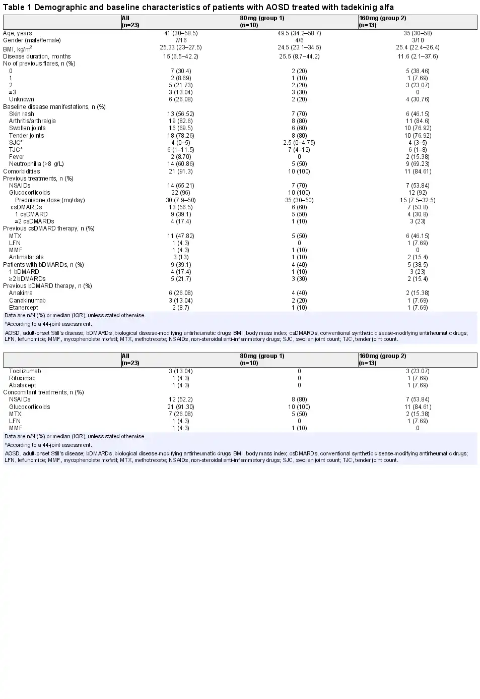 In conclusion, our results show that tadekinig alfa appears to have a favourable safety profile and is associated with early signs of efficacy in AOSD, thus warranting further clinical investigation.