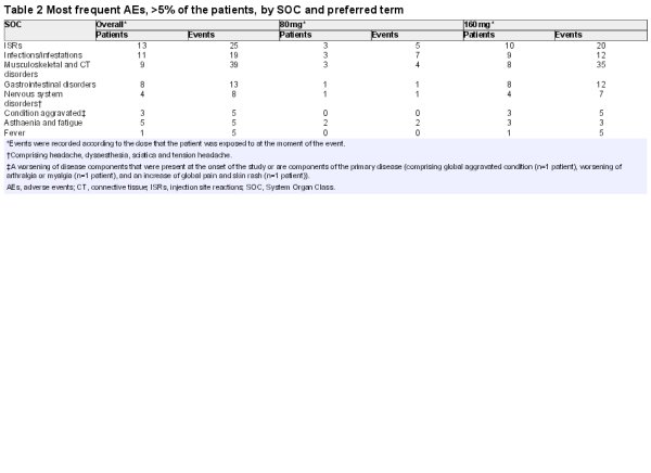 The description of AEs by System Organ Class is shown in table 2. One hundred and fifty-five treatment-emergent AEs were recorded; 47 were considered related to the study drug by the treating physicians. ISRs, upper airway infections and arthralgia were the most common AEs. Three and 10 patients showed manifestations of local ISRs in groups 1 and 2, respectively. Some patients had more than one episode and most were considered mild. Two patients in group 2 had moderately severe ISR.