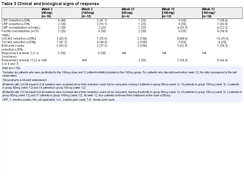 Secondary endpoints comprised clinical and biological signs of efficacy, including the evolution of body temperature, skin rash, number of SJC and TJC, patient global assessment, physician global assessment, pain assessment on a visual analogue scale (VAS), fatigue assessment on the VAS and dosage of prednisone with respect to baseline. Laboratory assessments included serum levels of CRP, serum amyloid A (SAA), ferritin, free IL-18, IL-6, tumour necrosis factor, IL-1 receptor antagonist (IL-1Ra), S100A8/9, S100A12 and blood leucocyte and granulocyte counts. All laboratory tests were performed in a centralised laboratory (MLM Medical Labs GmbH, Moenchengladbach, Germany; see online supplementary materials).