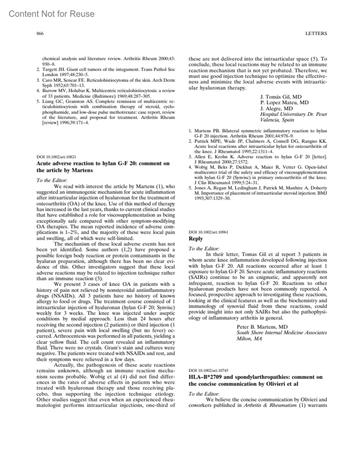 Acute adverse reaction to hylan G-F 20: comment on the article by MartensMartens, Peter B. MDAuthor information1South Shore Internal Medicine Associates, Milton, MAArthritis & Rheumatism 48(3):p 866, March 2003.Copyright © 2003, American College of Rheumatology
