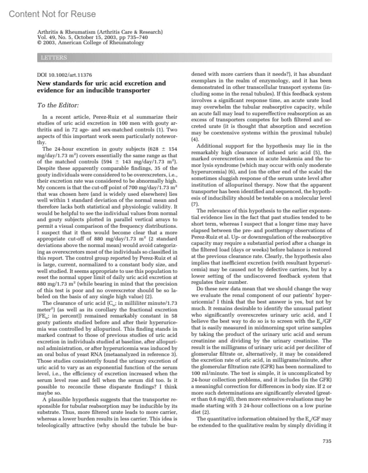 New standards for uric acid excretion and evidence for an inducible transporterPerez-Ruiz, Fernando MDHerrero-Beites, Ana MDAuthor informationHospital de Cruces, Baracaldo, Vizcaya, SpainArthritis & Rheumatism 49(5):p 736-737, October 2003.Copyright © 2003, American College of Rheumatology