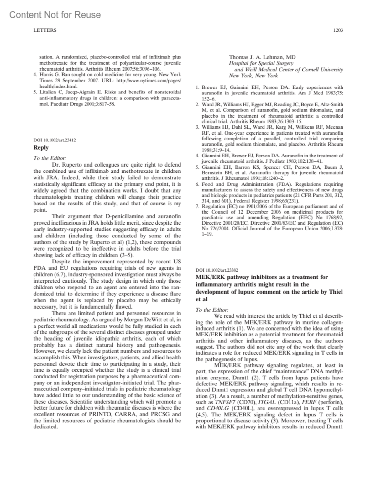 Clinical trials in pediatric rheumatology: Comment on the editorial by LehmanLehman, Thomas J. A. MDAuthor information1Hospital for Special Surgery, and Weill Medical Center of Cornell University, New York, New YorkArthritis & Rheumatism 58(4):p 1203, April 2008.Copyright © 2008, American College of Rheumatology