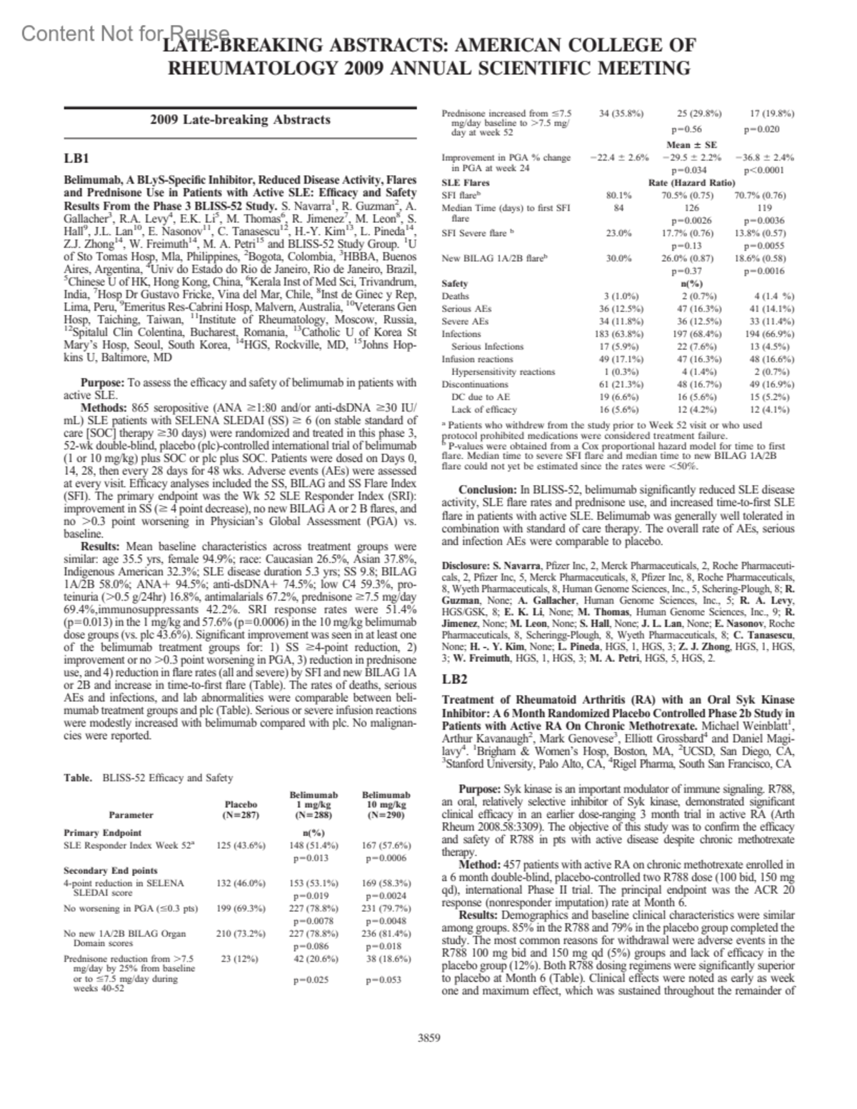 Belimumab, A BLyS-Specific Inhibitor, Reduced Disease Activity, Flares and Prednisone Use in Patients with Active SLE: Efficacy and Safety Results From the Phase 3 BLISS-52 Study.