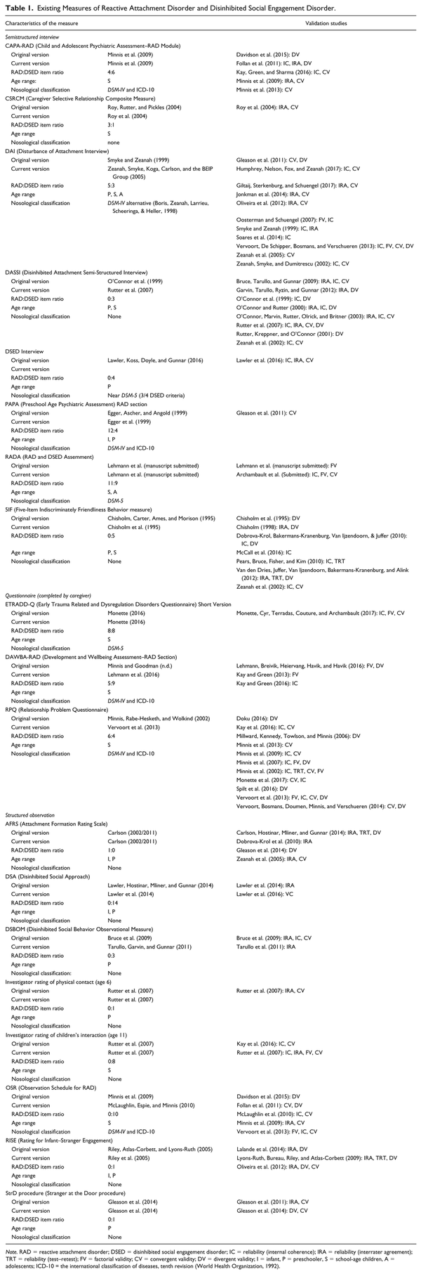 This brief review of existing instruments measuring RAD and DSED demonstrates that there are no fully validated instruments based on the updated criteria of the DSM-5. Furthermore, there are no structured observational instruments that enable assessment of RAD and DSED simultaneously. Existing observational instruments focus almost exclusively on DSED but do not entirely cover the DSM-5 DSED symptoms. Many of these instruments are also hard to use in clinical settings due to the amount of administration time. Of the available semistructured interviews, the Disturbances of Attachment Interview, the CAPA-RAD, and the DAWBA-RAD stand out because of strong psychometric properties and joint measurement of both RAD and DSED. However, none of these instruments have yet been updated to meet the DSM-5 criteria.