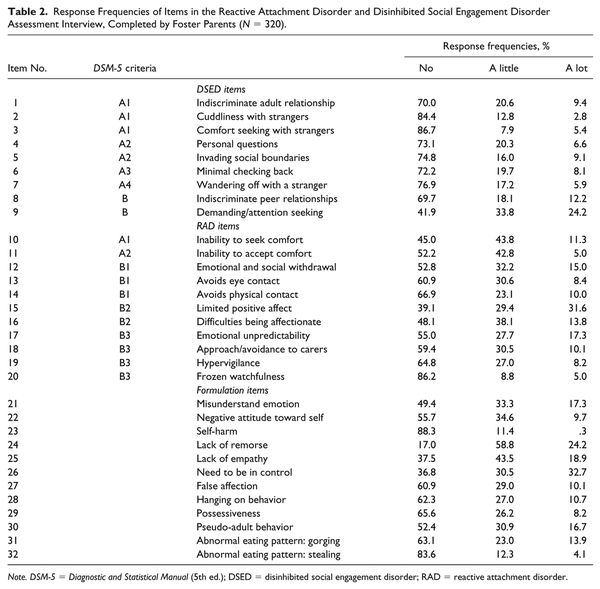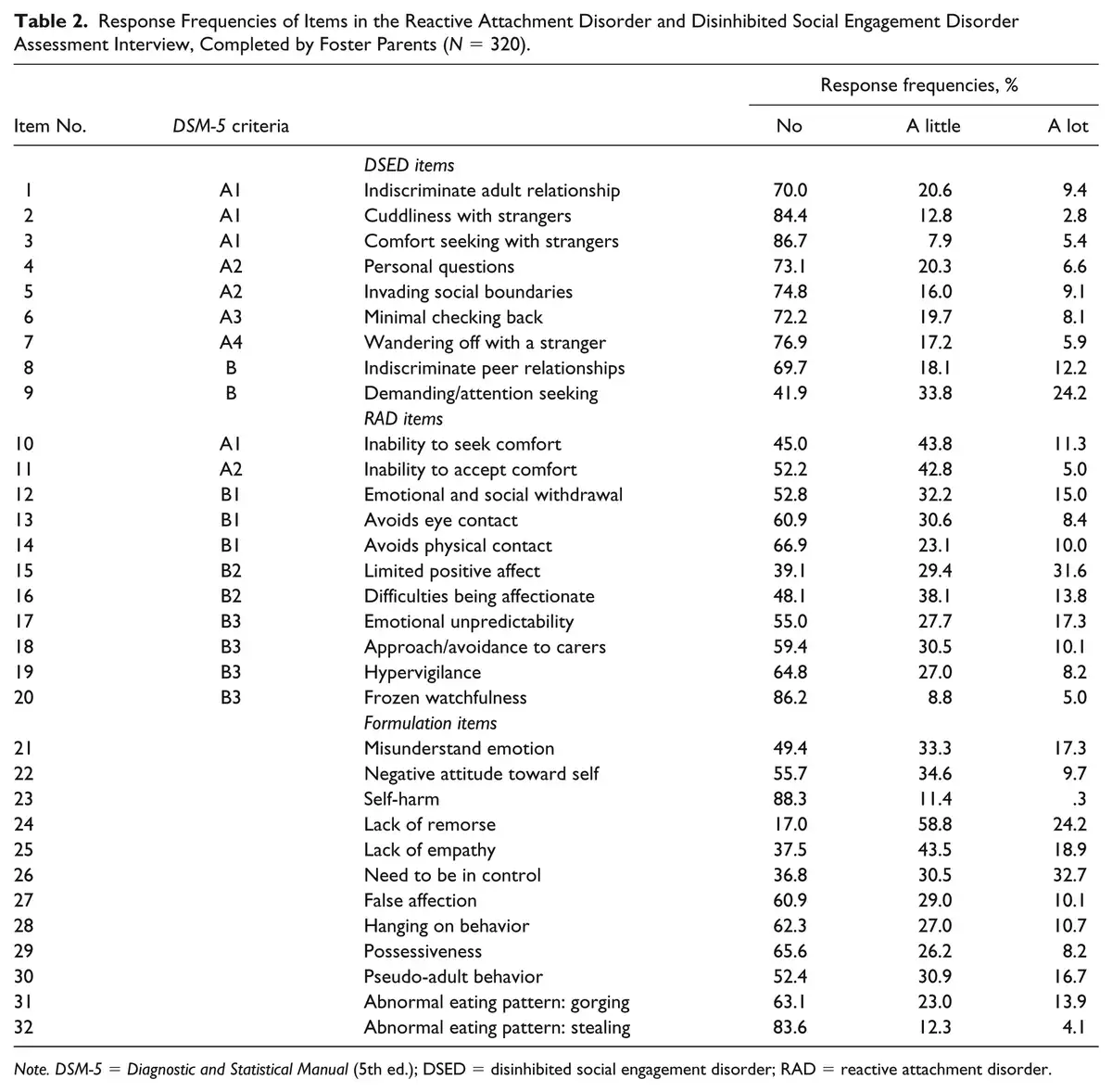 The study sample (N = 320) were aged between 11 to 17 years (M = 14.5, SD = 2.0), they had lived in foster care for a mean of 6.6 years (SD = 4.3), and 56.9% were boys. Table 2 shows response frequencies of the 9 DSED items, the 11 RAD items, and their corresponding DSM-5 criteria, as well as the 13 formulation items in the RADA.
