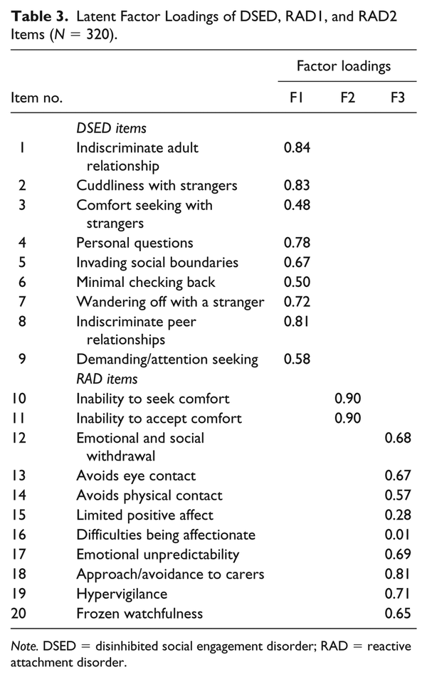 The DSED Item 6 (Minimal checking back, Criteria A3) showed high cross-loadings with both RAD1 and RAD2. This item had been amended to make it more appropriate for adolescents and was worded: Some young people act too independent for his/her age, for example by failing to let you know where she/he is and when she/he is coming back. Is she/he like that? Nearly 28% of the foster parents recognized this behavior in their youth. Still, our finding indicates that this item does not capture the behavior corresponding exclusively to DSED Criterion A3 for adolescents. Other groups of researchers have investigated indiscriminate behavior with adoptive parents of institutionalized children with use of the Five Item Indiscriminately Friendliness Behavior interview (5FI). In line with our finding, the 5FI item Wandering off without distress has been found to correlate weakly or not at all with other DSED items for cares of previously maltreated children (; ). The same result was found with use of the ETRAD-Q in school-aged children (). The issue could be that DSED Criterion A3 has both characteristics related to social disinhibition as well as to lack of social reference to caregivers, similar to behaviors associated with RAD. A further question therefore may be the specificity of Criterion A3 for DSED. Further studies using the RADA are needed to assess whether differently formulated items enable assessment of this criteria or whether Item 6 should be removed from the instrument.