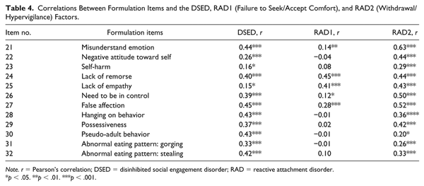Correlation analyses with latent variables and DWLS as estimator were conducted where (a) DSED, RAD1, and RAD2 were correlated with each of the formulation items separately and (b) time in foster care and child age were correlated with DSED, RAD1, and RAD2. Effect sizes were interpreted using the recommendations of .