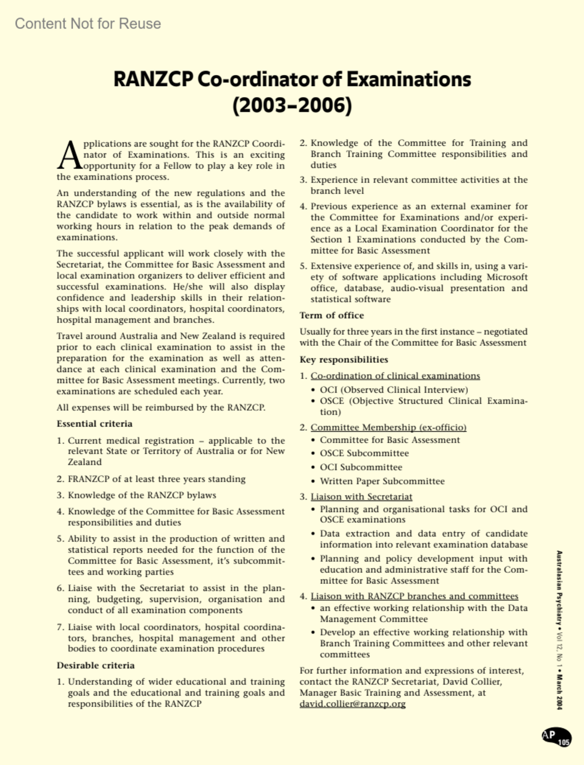 RANZCP Co-ordinator of Examinations (2003–2006)Australasian Psychiatry 12(1):p 105, March 2004.Copyright © 2004 Blackwell Science Ltd.
