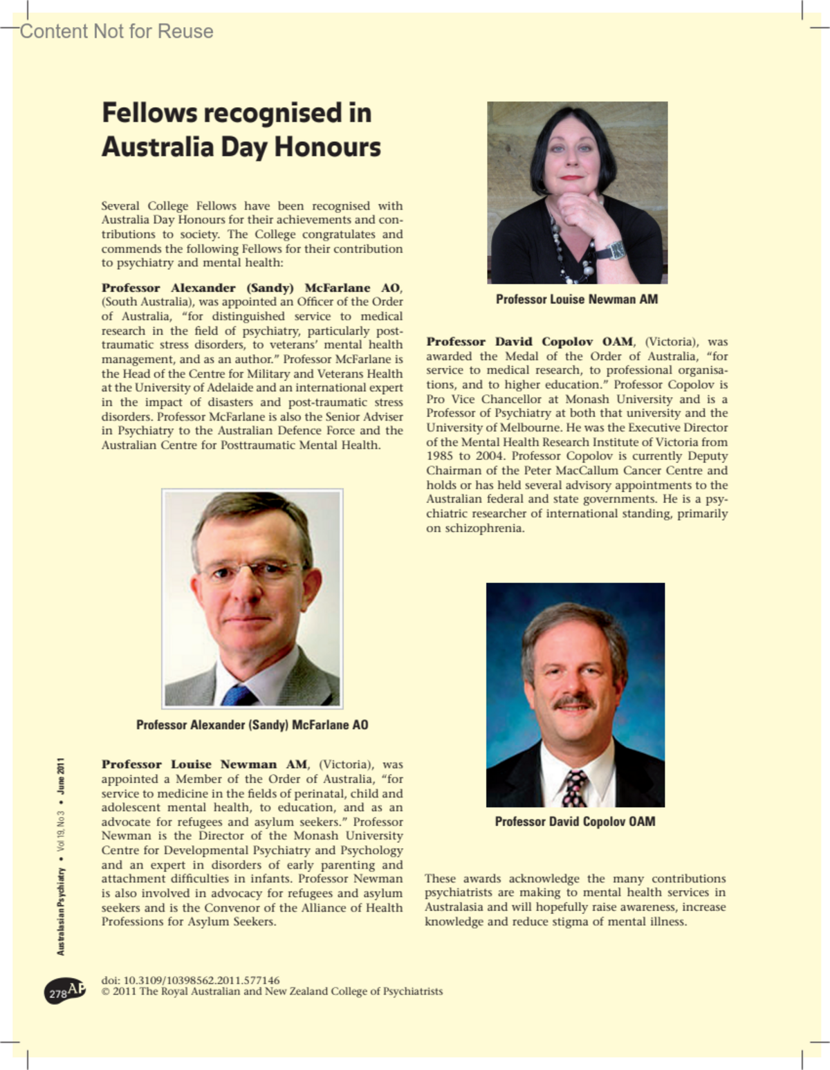 Fellows recognised in Australia Day HonoursAustralasian Psychiatry 19(3):p 278-285, June 2011.Copyright © 2011 Sage Publications