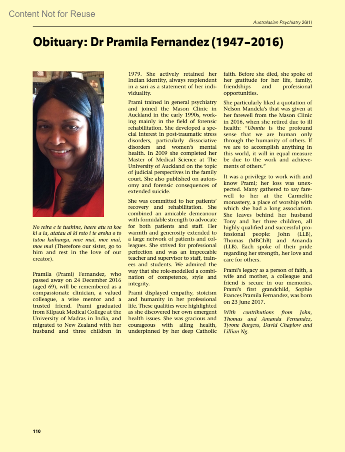 Obituary Dr Pramila Fernandez (1947–2016)Australasian Psychiatry 26(1):p 110, February 2018. | DOI: 10.1177/1039856217750723bCopyright © 2018 Sage Publications