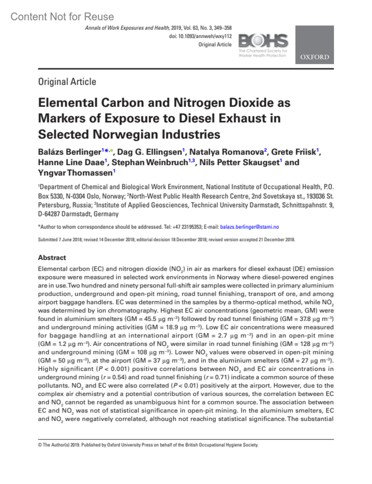 Elemental Carbon and Nitrogen Dioxide as Markers of Exposure to Diesel Exhaust in Selected Norwegian Industries