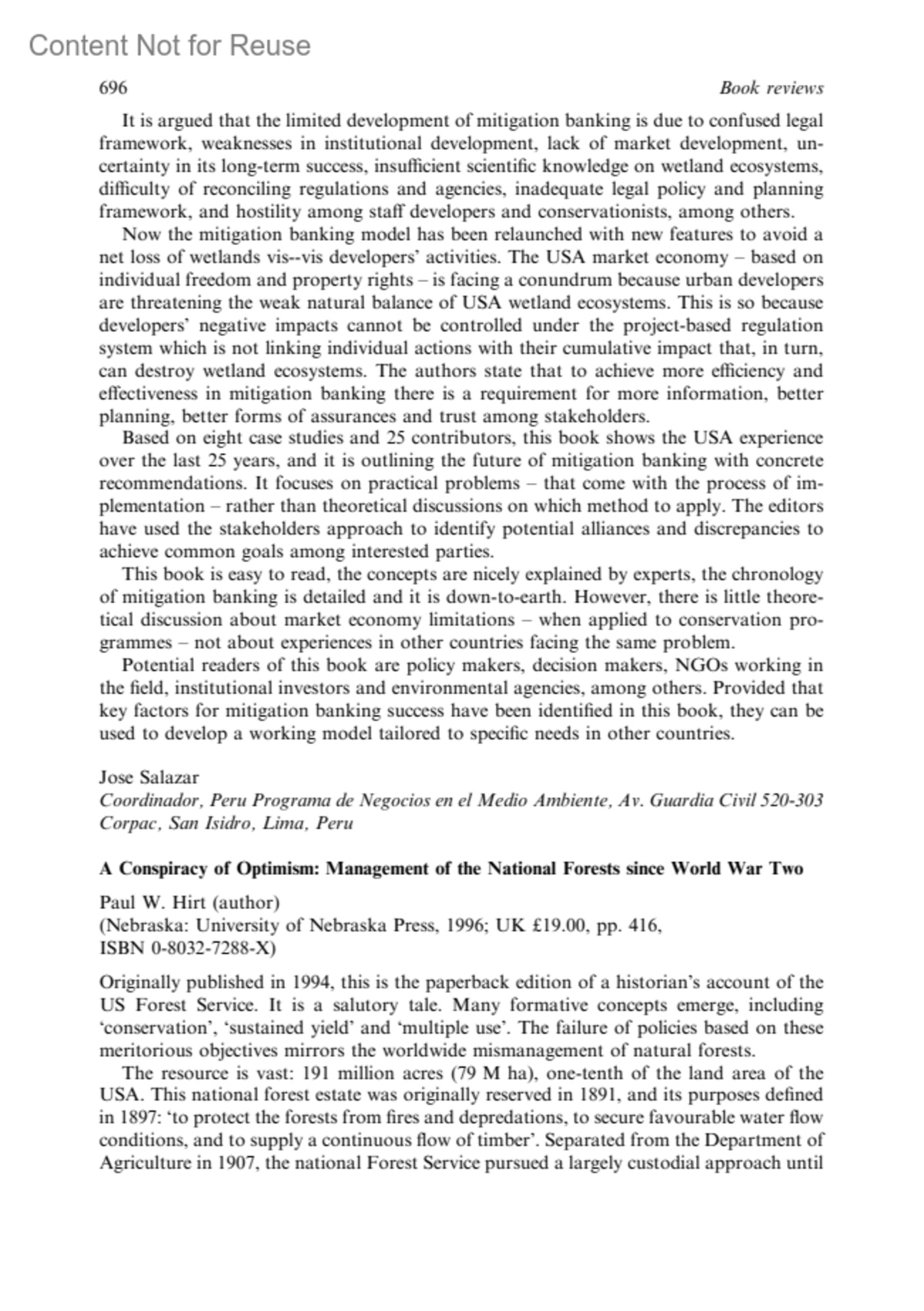 A conspiracy of OptimismManagement of the National Forests since World War TwoHirt, Paul W.Author informationNebraska: University of Nebraska Press, 1996; UKBiodiversity & Conservation 7(5):p 696-697, 1998.Copyright ©1998 Kluwer Academic Publishers