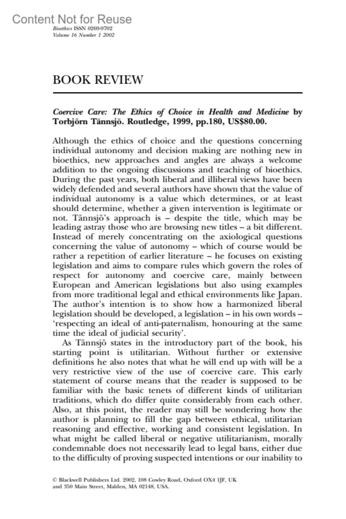 Coercive CareThe Ethics of Choice in Health and MedicineGYLLING, HETA ALEKSANDRAAuthor informationUniversity of HelsinkiBioethics 16(1):p 84-86, February 2002.Copyright © Copyright Notice©2002