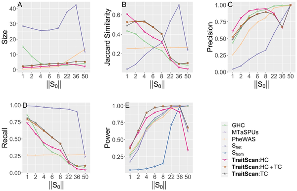 Simulation scenario 1 with varying numbers of truly associated traits ( ). (A) Size. (B) Jaccard similarity. (C) Precision. (D) Recall. (E) Power.
