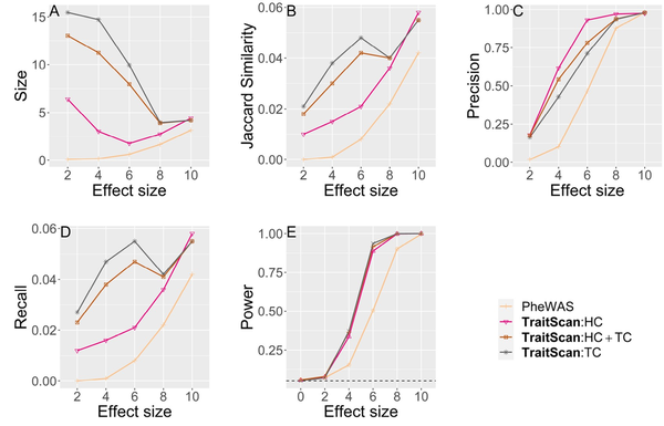 We conducted simulations under multiple scenarios to show TraitScan has higher power and Jaccard similarity under moderately sparse ( ) and sparse situations ( ). We focus the discussion on the scenarios with varying numbers of truly associated traits (scenario 1) or with real data variance-covariance matrix (scenario 2) and briefly discuss the other four scenarios and their results.