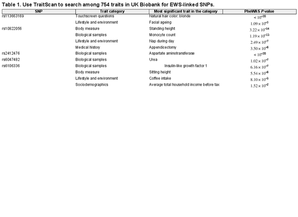 After applying TraitScan on the genetic scores, neither of the two genes KIZ (P-value ) and RREB1 (P-value = 1) reached statistical significance in TraitScan, although the trait insulin-like growth factor 1 (IGF-1) picked up by KIZ was marginally significant. On the other hand, imputed gene expression of RREB1, of which rs7742053 was an expression quantitative trait loci (eQTL), had no evidence of linking to any of the 754 traits. The genetic score of six EWS SNPs, however, was significantly associated with three traits: hair color (blonde), skin color, and facial aging (TraitScan P-value ), while the PheWAS identified two additional traits on the EWS score: hair color (dark brown) and ease of skin tanning.
