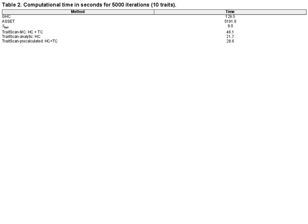 Given a fixed number of , TraitScan has an time complexity. If the number of is proportional to p, the time complexity is . While for the other multi-trait analysis methods, the test in CPASSOC also has an time complexity given a fixed P-value threshold, since it ranks the P-values and directly applies the threshold onto the raw P-values. When the thresholds are set as the input P-values, which is recommended in the CPASSOC pipeline, its time complexity is also . The ASSET has an time complexity, meaning the computational time will be doubled once adding one more trait. Table 2 lists the computational time for analyzing 10 traits 5000 times using different methods, including TraitScan with 10 000 iterations in the MC simulation (TraitScan-MC), TraitScan: HC test based on the analytical null distribution (TraitScan-analytic), and TraitScan test using a precalculated null distribution estimated by MC with a given p (TraitScan-precalculated). All the programs were ran on Intel Haswell E5-2680v3 processors with 16-GB memory, and the trait correlations and parameters were the same as in Scenario 1.