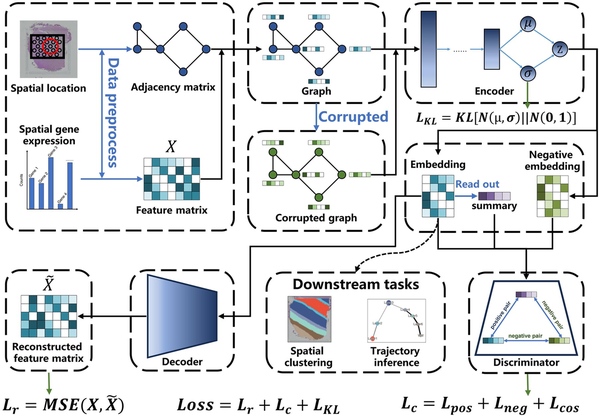 To enhance the informativeness and discriminative power of the embedding H, we employ a self-supervised contrastive learning strategy, which ensures that the model can efficiently capture the local spatial context of the spots. To generate dissimilar examples, we apply data augmentation to create a corrupted graph. In addition, using both the original and corrupted graphs as inputs, the encoder generates two corresponding representation matrices and for the spots, as below: