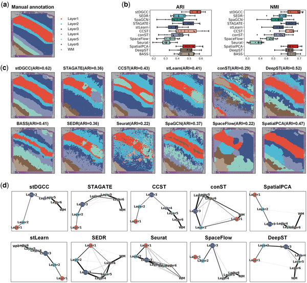 Figure 2a and c depicts in a visual manner the outcomes of the manual annotation and each method on section 151509. The annotations reveal a distinct transition from layer 1 to layer 3 in both directions. Among all methods, only stDGCC accurately identified the transition, exhibiting smooth and well-defined boundaries in the individual segmentation results. Additionally, we validated the inferred trajectories using the PAGA algorithm. Note that SpaGCN and BASS being end-to-end clustering methods, cannot be visualized using PAGA. As seen in Fig. 2d, both stDGCC- and CCST-embedded PAGA plots depict a linear developmental trajectory from layer 1 to layer 6 and display similarities between adjacent layers. Conversely, the STAGATE-, stLearn-, SpatialPCA-, DeepST-, and SpaceFlow-embedded PAGA results exhibit a limited number of anomalous links, whereas the PAGA results from Seurat, SEDR, and conST demonstrate a significant number of mixed anomalous links. Clustering results for the other sections are in Supplementary Figs S5 and S6. In addition, for a more comprehensive comparison, we also used fixed parameters among all datasets. As shown in Supplementary Fig. S36a, stDGCC still has an advantage over other baseline methods on the DLPFC dataset at fixed parameters.