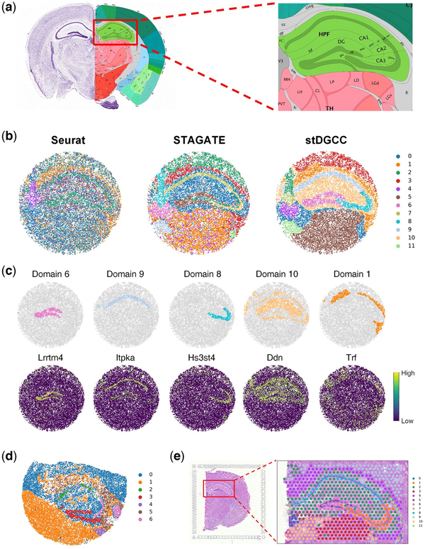 (a) Allen mouse brain reference atlas. (b) Spatial domains generated by Seurat, STAGATE, and stDGCC on the Slide-seqV2 mouse hippocampus dataset. (c) Visualization of marker genes and corresponding domains delineated by stDGCC. (d) Spatial domains generated by stDGCC on the mouse hippocampus dataset profiled by Slide-seq. (e) Spatial domains generated by stDGCC on the mouse brain dataset profiled by 10× Visium.