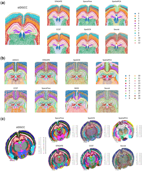 Some methods were impractical to apply for these three datasets due to high memory requirements. In the Xenium mouse brain dataset analysis, as depicted in Fig. 4a, stDGCC, STAGATE, CCST, and SpaGCN effectively identified key structural organizations within the mouse brain, such as CA1sp, CA3sp, and DG-sg. In particular, stDGCC and STAGATE provided a nuanced representation of multiple cerebral cortices, highlighting clear and symmetrical brain structures. Regarding the CosMx mouse brain dataset, Fig. 4b illustrates that most of the methodologies used successfully identified various biological structures within the mouse brain. In particular, stDGCC, STAGATE, BASS, and SpatialPCA achieved enhanced clarity and more coherent stratification of the cerebral cortex. Among them, stDGCC was distinguished by its ability to reveal detailed stratification within the cortical layers, whereas SpatialPCA facilitated the initial identification and comparison of overall brain patterns by providing a smoother structural view. The integration of these techniques enriches our understanding of the complex biological characteristics of the brain. For the Vizgen MERFISH mouse brain dataset (Fig. 4c), SpaGCN and Seurat could outline the major biological structures, but many clusters were intermixed. For the other methods, only STAGATE, CCST, and stDGCC accurately delineated the organization of key structures in the mouse brain, such as CA1sp, CA3sp, and DG-sg. Notably, stDGCC demonstrated exceptional clarity regarding biological structures among these methods. Furthermore, stDGCC also showcased a well-defined, hierarchically coherent cerebral cortex, setting it apart from the results achieved by other methods.