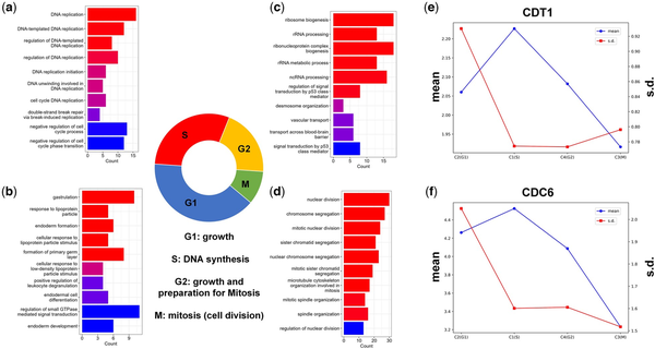 (a–d) GO terms for clustered cell groups C1 (a), C2 (b), C4 (c), and C3 (d), corresponding to S, G1, G2, and M phase, respectively. (e, f) The mean and SD of CDT1 (e) and CDC6 (f).