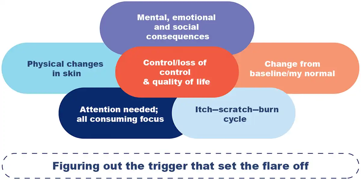 In this qualitative study of adults with AD, we identified six concepts important to the definition of AD flare from the patient perspective: (i) changes from patient baseline/normal; (ii) mental, emotional and social consequences; (iii) physical changes in skin; (iv) more attention needed/all ­consuming focus; (v) itch–scratch–burn cycle; and (vi) control/lack of control and QoL. Identifying a trigger for a flare was an important underlying theme for participants related to how they experience and cope with a flare but did not contribute to how they define flare. These results highlight that although AD flares can be highly variable and complicated in nature, there are commonalities across the patient experience that can help to inform a patient-centred definition that may include multiple domains. Previously published definitions of AD flare did not resonate with participants, citing complications around trying to reduce a complex experience and symptoms of flare to a quantifiable number, as well as issues with medical jargon.
