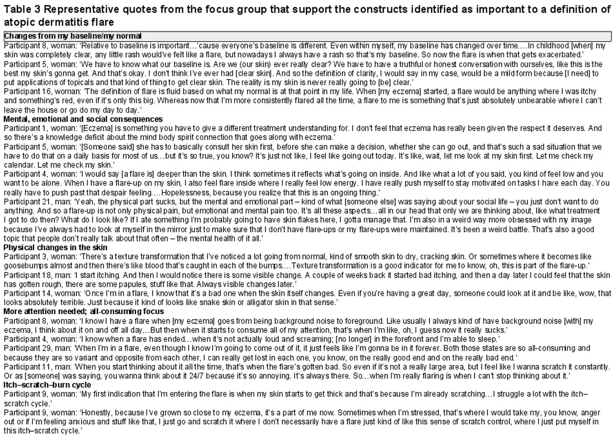 In developing the key components of a framework to inform a definition of ‘flare’, the authors specifically looked at the themes that were raised in relation to defining a flare by the participants, ensuring not to include themes from adjacent discussion around treatment and impact of AD. This framing of the results was purposefully separate from the personal experiences or consequences of a flare (i.e. tingling sensation, loss of sleep and ways of treating).