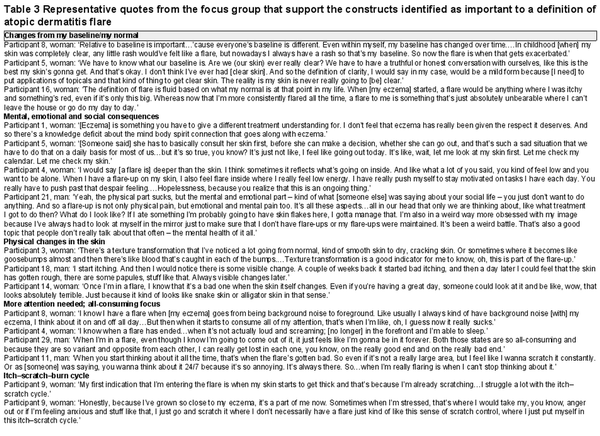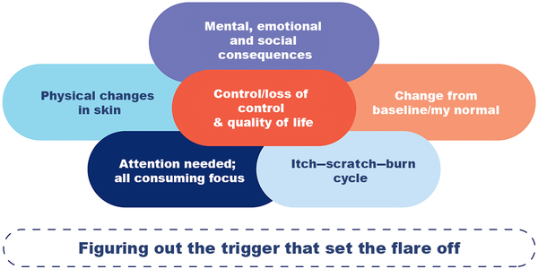 Concepts identified by patients as important to a definition of flare were changes from patient’s baseline/patient’s normal, mental/emotional/social consequences, physical changes in skin, attention needed/all-consuming focus, itch–scratch–burn cycle and control/loss of control/quality of life.