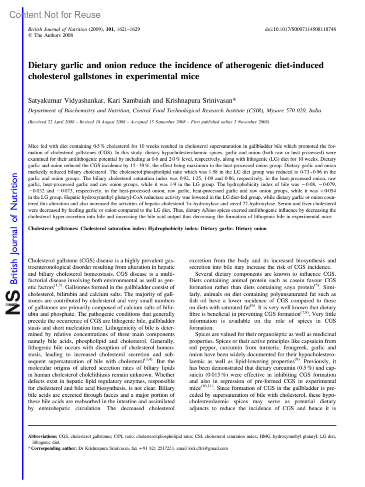 Dietary garlic and onion reduce the incidence of atherogenic diet-induced cholesterol gallstones in experimental mice