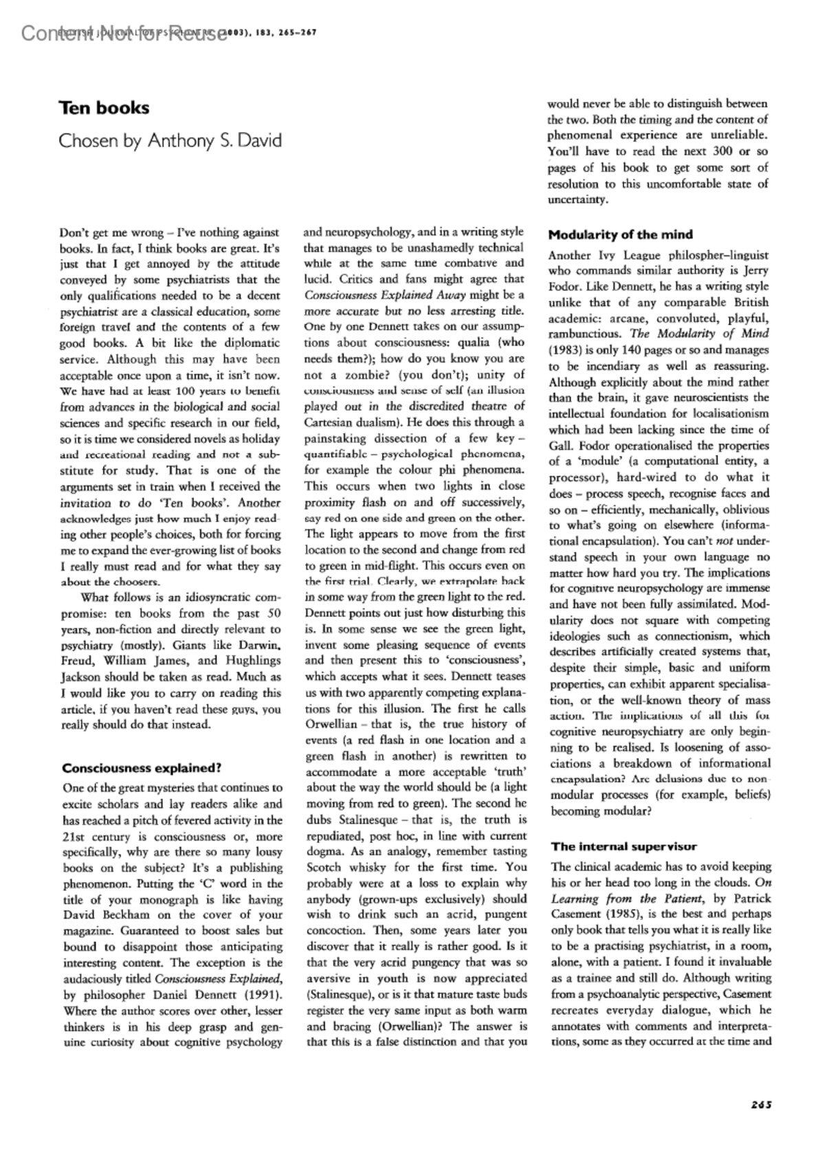 Chosen by Anthony S. DavidDavid, Anthony S.Author informationProfessor of Cognitive Neuropsychiatry, PO Box 68, Institute of Psychiatry, De Crespigny Park, Denmark Hill, London SE5 8AF, UKBritish Journal of Psychiatry 183:p 265-267, September 2003.Copyright © 2003 The Royal College of Psychiatrists