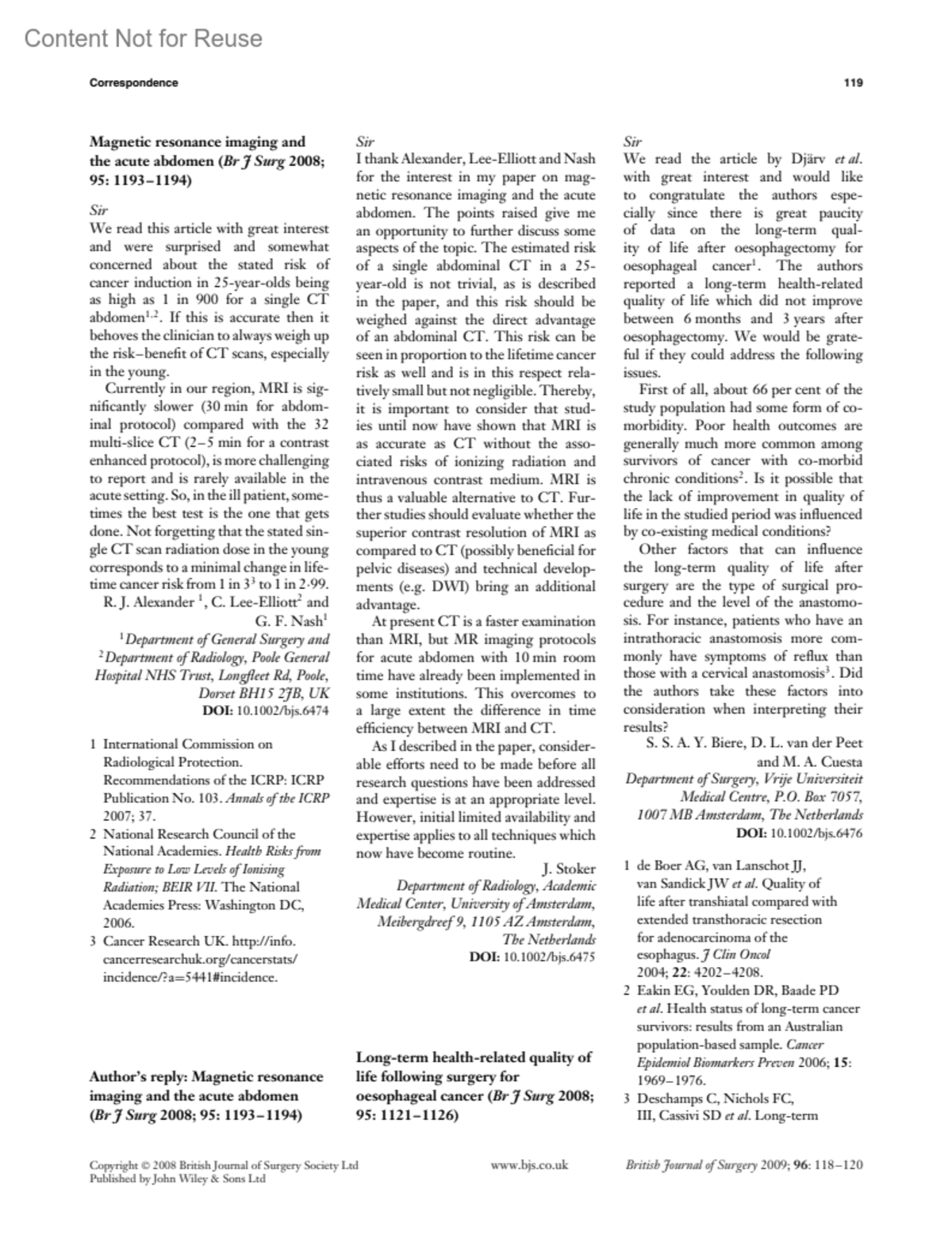 The Editors welcome topical correspondence from readers relating to articles published in the Journal. Responses should be sent electronically via the BJS website (www.bjs.co.uk). All letters will be reviewed and, if approved, appear on the website. A selection of these will be edited and published in the Journal. Letters must be no more than 250 words in length. Copyright © 2008 British Journal of Surgery Society Ltd. Published by John Wiley & Sons, Ltd.