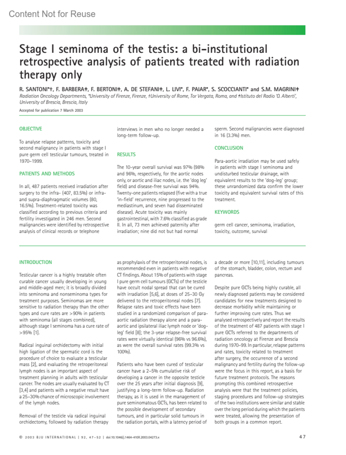 Stage I seminoma of the testisa bi–institutional retrospective analysis of patients treated with radiation therapy onlyFOSTER, R.Author informationIndianapolis, USABJU International 92(1):p 52, July 2003.Copyright © 2003 Blackwell Science Ltd.