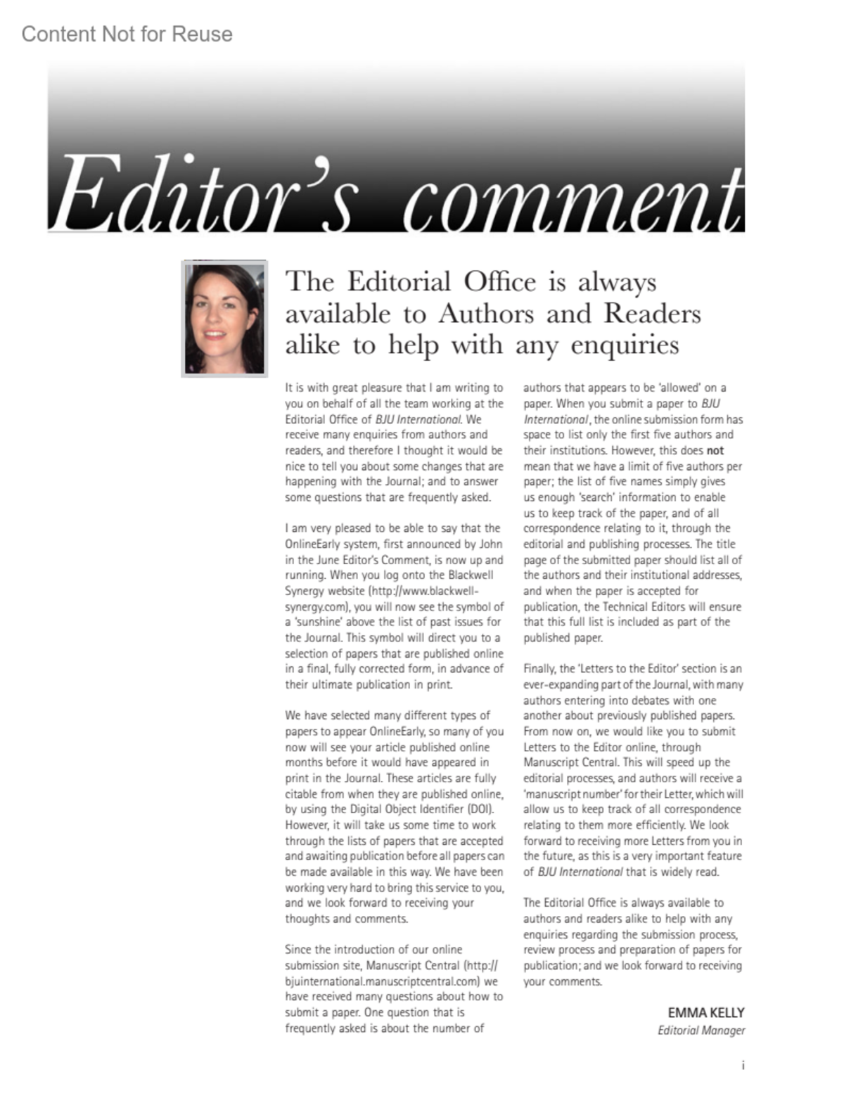 The Editorial Office is always available to Authors and Readers alike to help with any enquiriesKELLY, EMMA Editorial ManagerBJU International 96(6):p i, October 2005.Copyright © 2005 Blackwell Publishing Ltd.