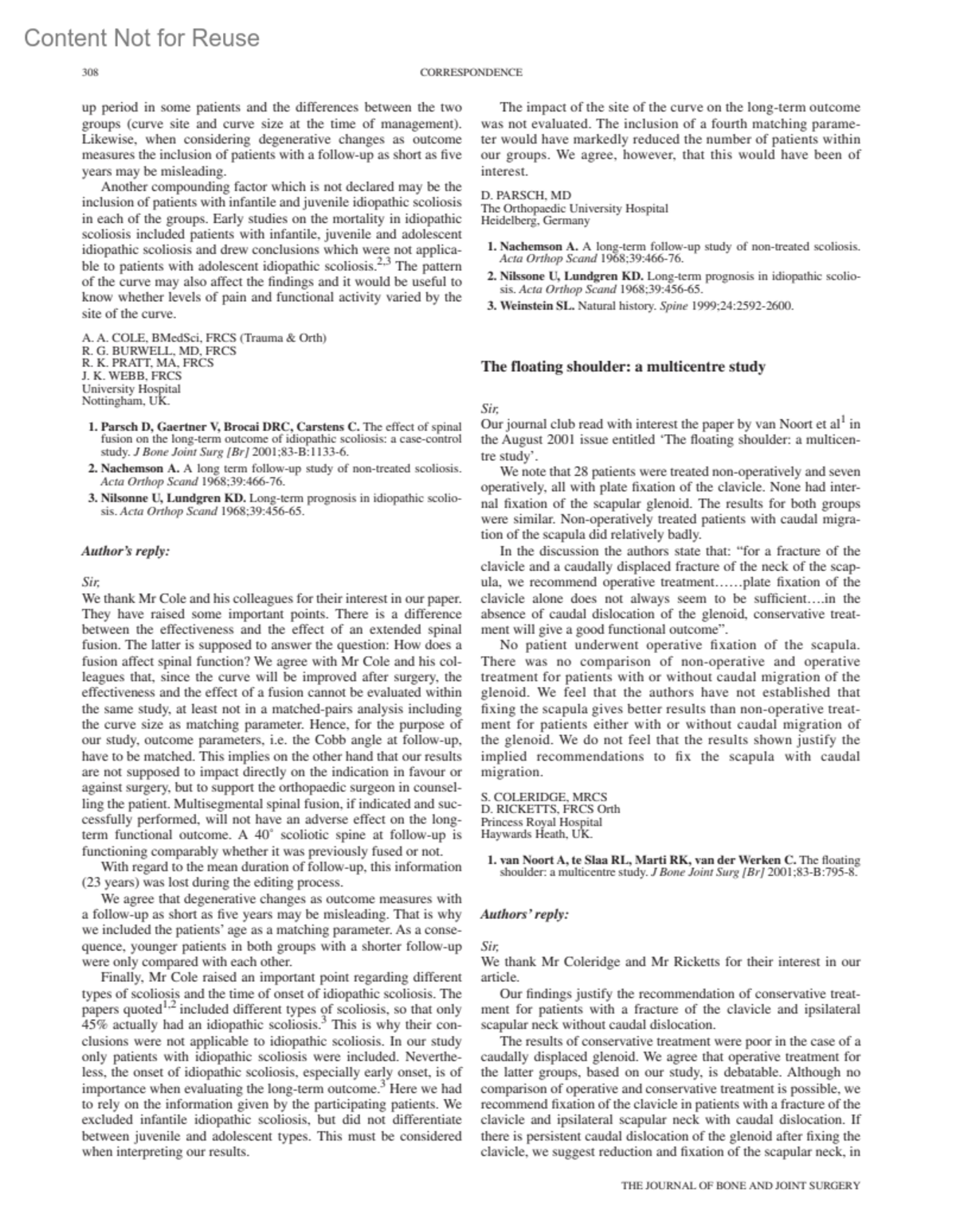 The floating shoulder: a multicentre studyVAN NOORT, A. MDMEHTA, J. S. MS Orth, D Orth, MCh OrthAuthor informationUniversity Hospital of Nijmegen; Nijmegen, The Netherlands. (VAN NOORT)Gosforth; Newcastle upon Tyne, UK. (MEHTA)Journal of Bone and Joint Surgery, British Volume 85-B(2):p 308-309, March 2003.Copyright © 2003 British Editorial Society of Bone and Joint Surgery